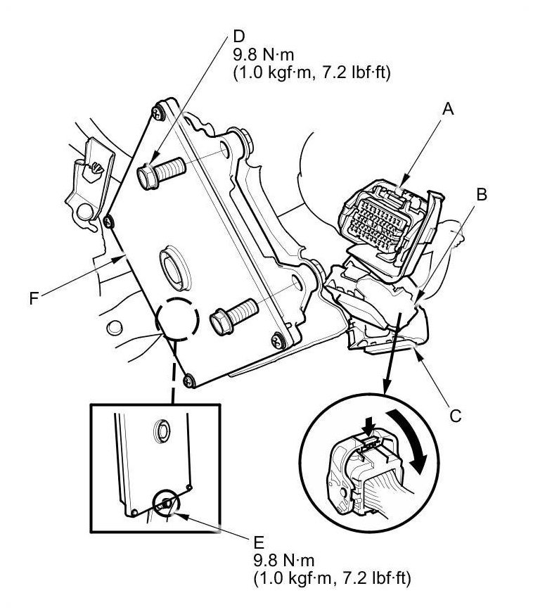 11. Disconnect ECM/PCM connectors A, B, and C, then remove the ECM/PCM (F).
