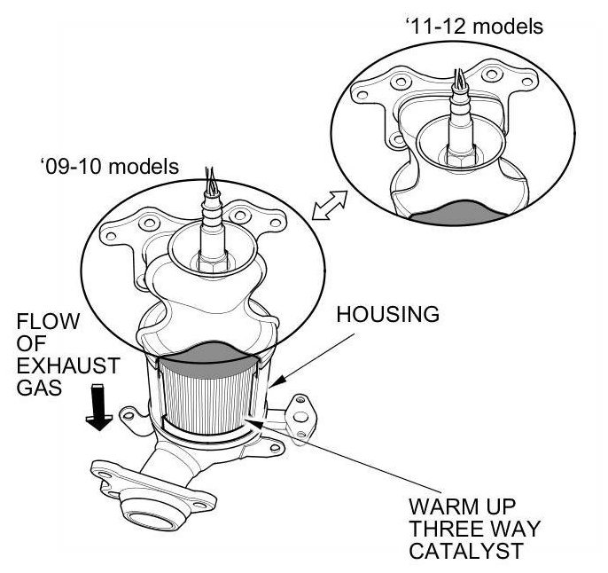 The WU-TWC and the under-floor TWC convert hydrocarbons (HC), carbon monoxide (CO), and oxides of nitrogen (NOx) in the exhaust gas to carbon dioxide (CO2), nitrogen (N2), and water vapor.