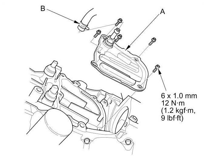 - Apply a 1.5 mm (0.059 in) diameter bread of liquid gasket along the broken line (A).