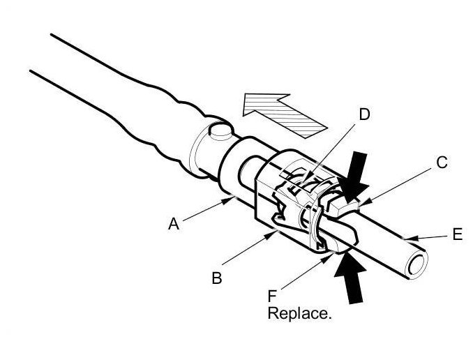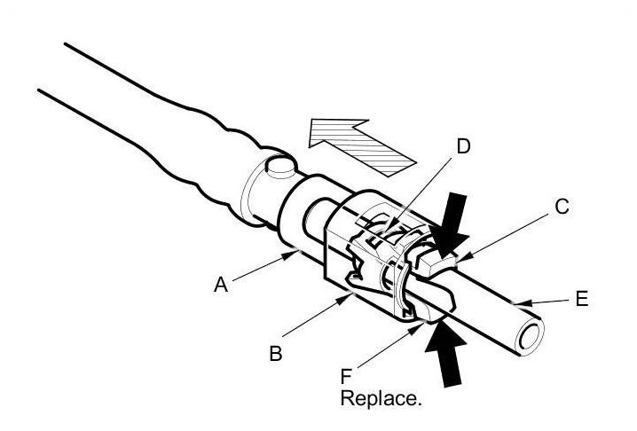 - Do not remove the retainer from the line; once removed, the retainer (F) must be replaced with a new one.