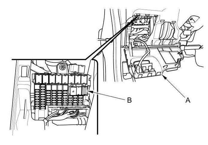 2. Remove PGM-FI main relay 2 (B) from the under- dash fuse/relay box.