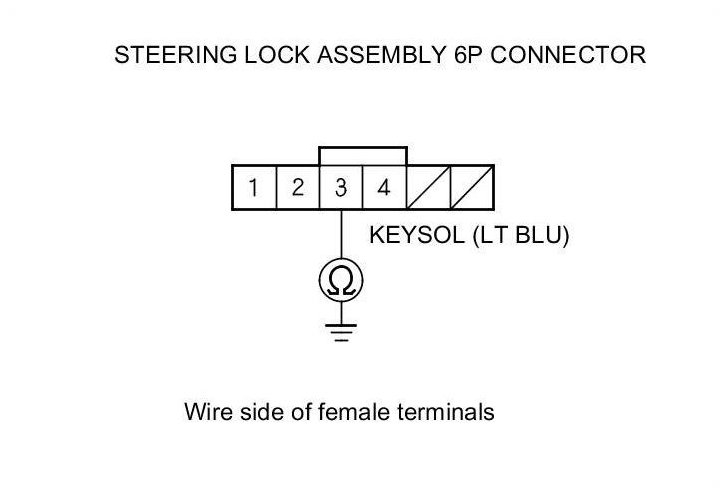 11. Check for continuity between under-dash fuse/relay box connector M (34P) terminal No. 17 and steering lock 6P connector terminal No. 3.