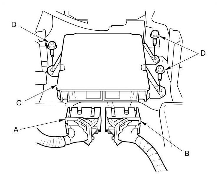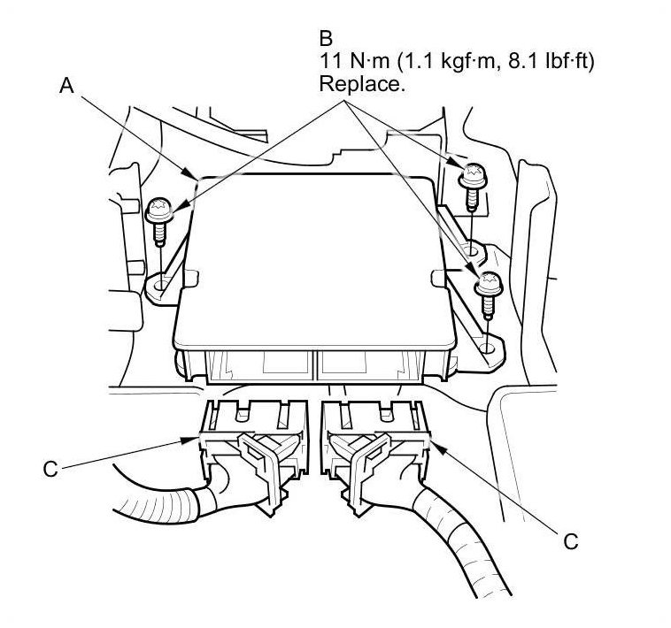 1. Install the SRS unit (A) with new TORX bolts (B), then connect the SRS connectors (C) to the SRS unit; push them into position until they click and the lever locks are fully secured.