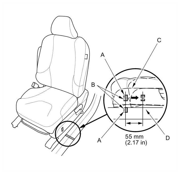 7. Using two pieces of tape (A), make alignment marks (B) on the the seat's outer cover (C) and the front door sill trim (D) as shown. The driver's seat position sensor should read NEAR.