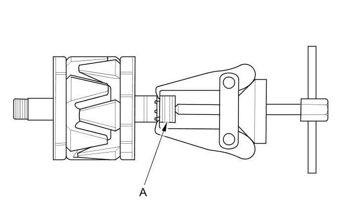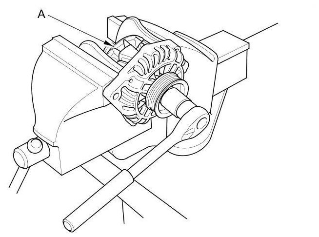7. If you are not replacing the front bearing and/or the rear bearing, go to step 15. Clamp the rotor (A) in a soft-jawed vise, then remove the pulley locknut.