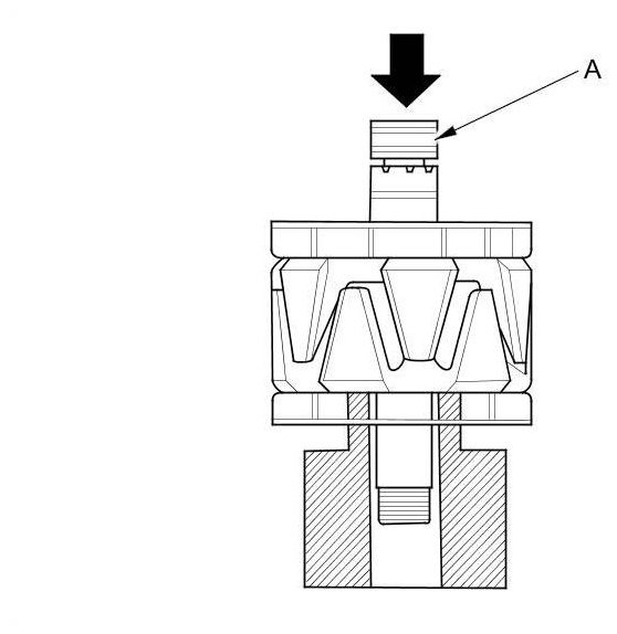 11. Use a hand press to install a new rear bearing (A). Apply pressure only on the inner race to avoid damaging the bearing.