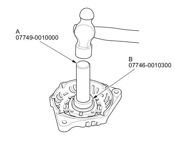 14. Install a new front bearing in the drive-end housing with a hammer, the driver handle, 15 x 135L (A), and the bearing driver attachment, 42 x 47 mm (B).