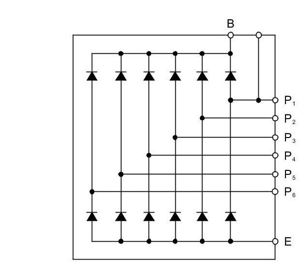 18. Check for continuity in each direction, between the B terminal and P terminals, and between the E terminal and P terminals of each diode pair. All diodes should have continuity in only one direction. Because the rectifier diodes are designed to allow current to pass in one direction, and the rectifier is made up of six diodes (six pairs), you must test each diode in both directions for continuity with an ohmmeter that has diode checking capability: a total of 24 checks: