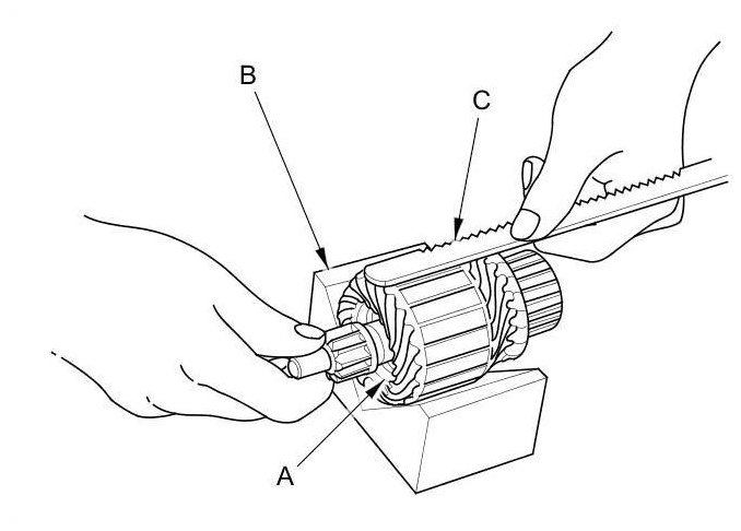 8. Place the armature (A) on an armature tester (B). Hold a hacksaw blade (C) on the armature core. If the blade is attracted to the core while the core is turned, the armature is shorted. Replace the armature.