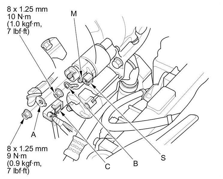 2. Disconnect the positive starter cable (A), the motor wire (B), and the S terminal connector (C).