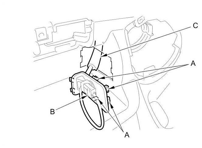6. With navigation system: On the passenger's side of the dashboard, release the hooks (A), then remove the USB subharness holder (B) along with the USB subharness (C).