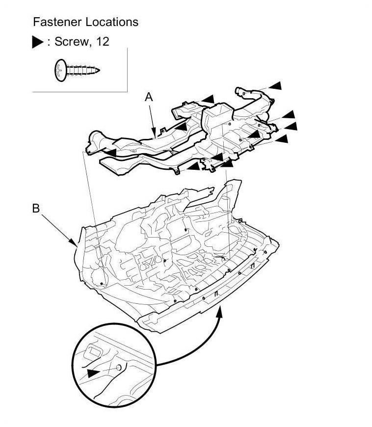 10. Remove the screws, then remove the dashboard duct (A) from the dashboard (B).