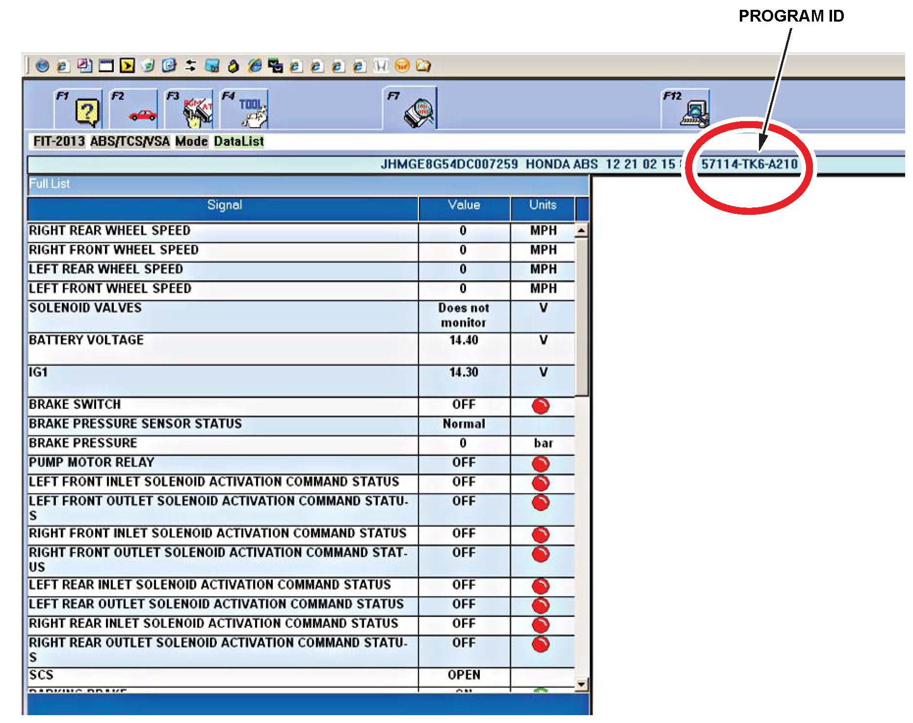 If you see the message This vehicle does not need an update at this time." connect the HDS, select VSA, then select Data List. You must make sure the program ID in the vehicle is 57114-TK6-A21 (M/T) or 57114-TK6-A31 (A/T) or later. If it is not, you need to update the HDS and the MVCI, then do the update again.