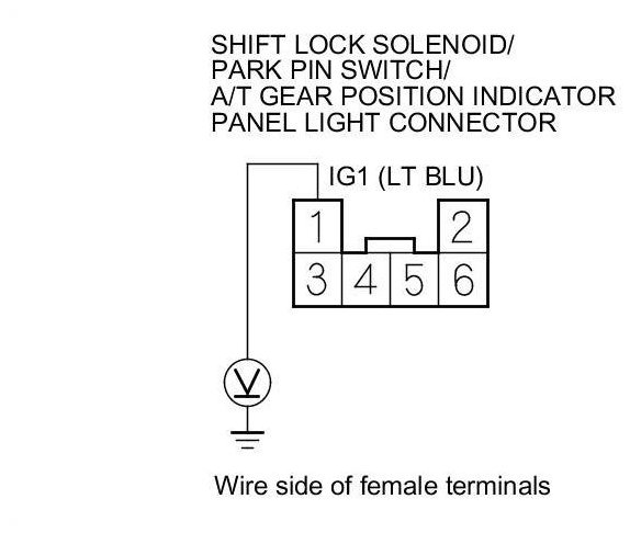 10. Measure the voltage between shift lock solenoid/park pin switch/A/T gear position indicator panel light connector terminal No. 1 and body ground.