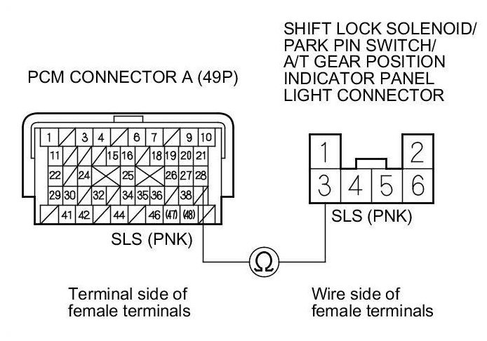 Repair open in the wire between PCM connector terminal A28 and shift lock solenoid/park pin switch/A/T gear position indicator panel light connector.