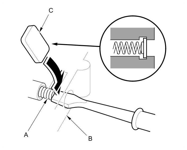 3. Install the valve and the valve spring (A) in the valve body (B). Push the valve spring in with a screwdriver, then install the spring seat (C).