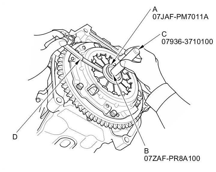 2. Check the evenness of the height of the diaphragm spring fingers using the clutch alignment disc (A), clutch alignment shaft (B), remover handle (C), and a feeler gauge (D). If the height difference is more than the service limit, replace the pressure plate.