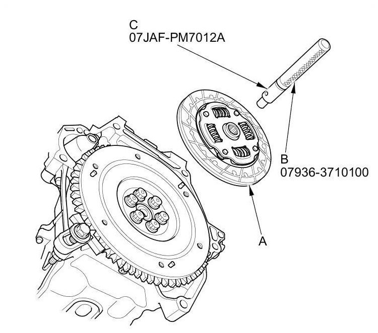 8. Remove the clutch disc (A), the remover handle (B), and the clutch alignment shaft (C).