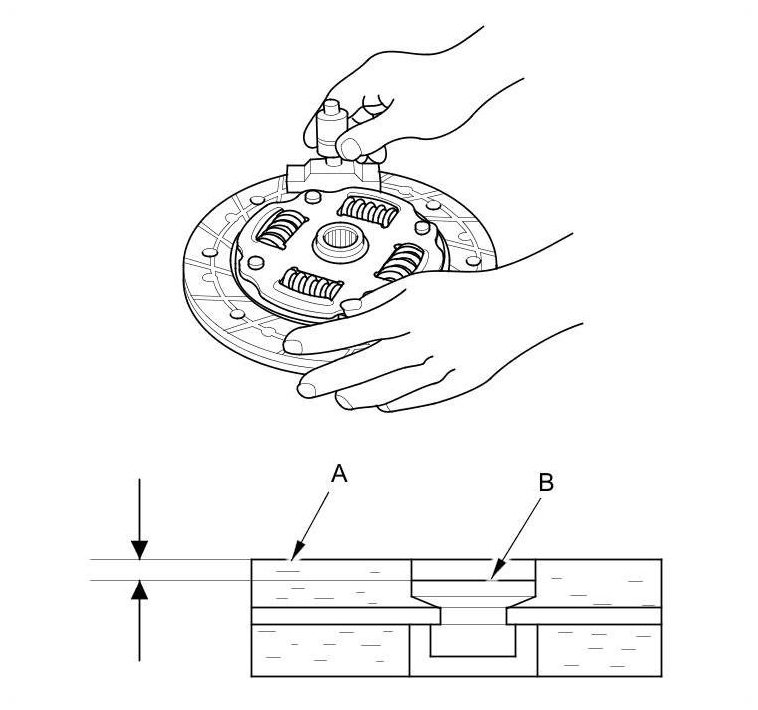 11. Measure the rivet depth from the clutch disc lining surface (A) to the rivets (B) on both sides. If the measurement is less than the service limit, replace the clutch disc.