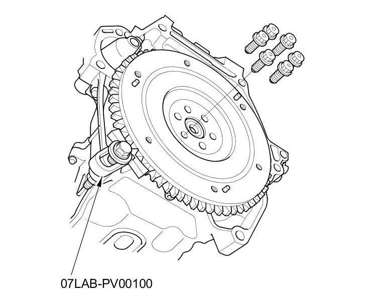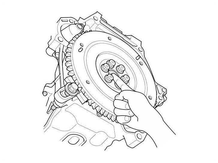 17. Loosen the flywheel mounting bolts in a crisscross pattern in several steps. Remove the bolts, then remove the flywheel and the ring gear holder.