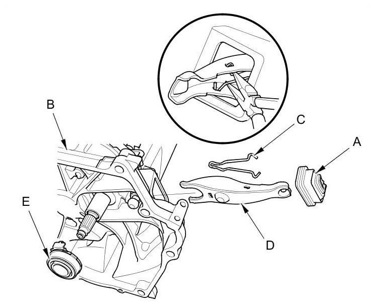 3. Squeeze the release fork set spring (C) with pliers to remove the release fork (D) from the clutch housing. Remove the release bearing (E).