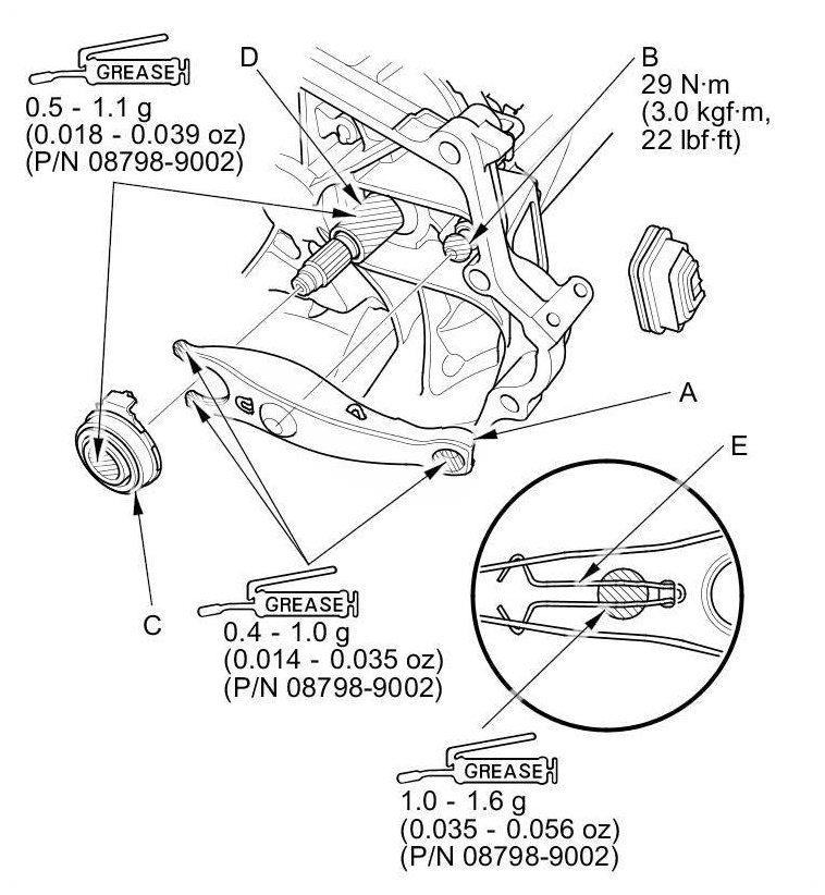 5. Apply high temp urea grease (P/N 08798-9002) to the release fork (A), the release fork bolt (B), the release bearing (C), and the release bearing guide (D) in the shaded areas, then set the release fork set spring (E).