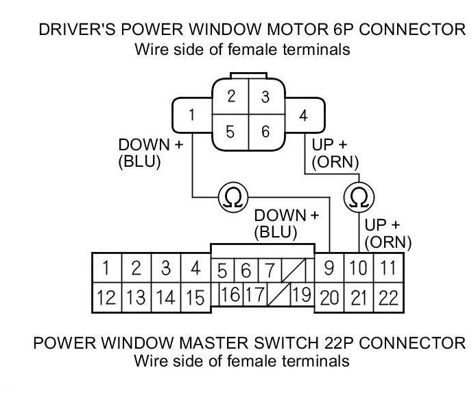 6. Check for continuity between power window master switch 22P connector terminals No. 9 and No. 10 and driver's power window motor 6P connector terminals No. 1 and No. 4 respectively. There should be continuity.