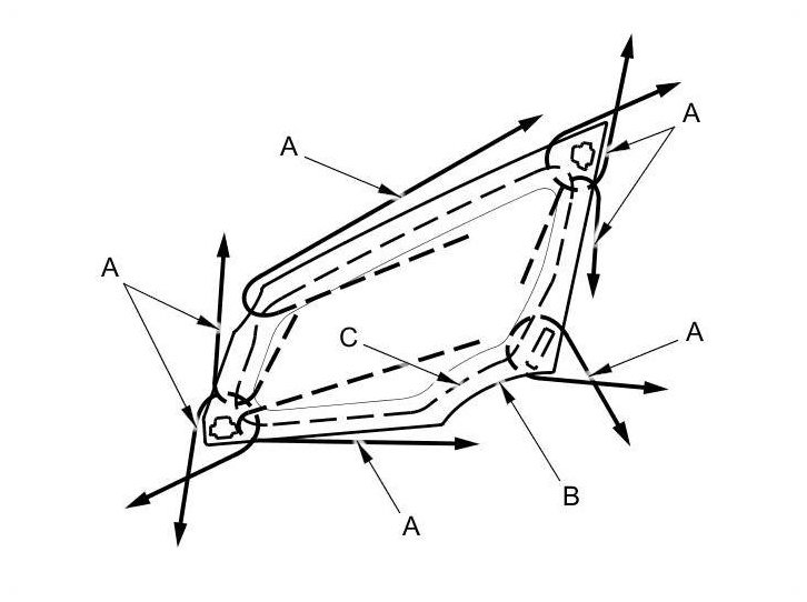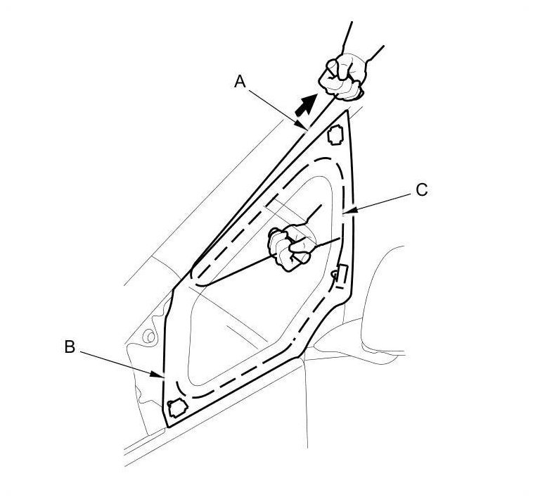 5. With a helper on the outside, pull the piano wire (A) back and forth in a sawing motion. Hold the piano wire as close to the front corner glass (B) as possible to prevent damage to the body, and carefully cut through the adhesive (C) around the entire front corner glass.