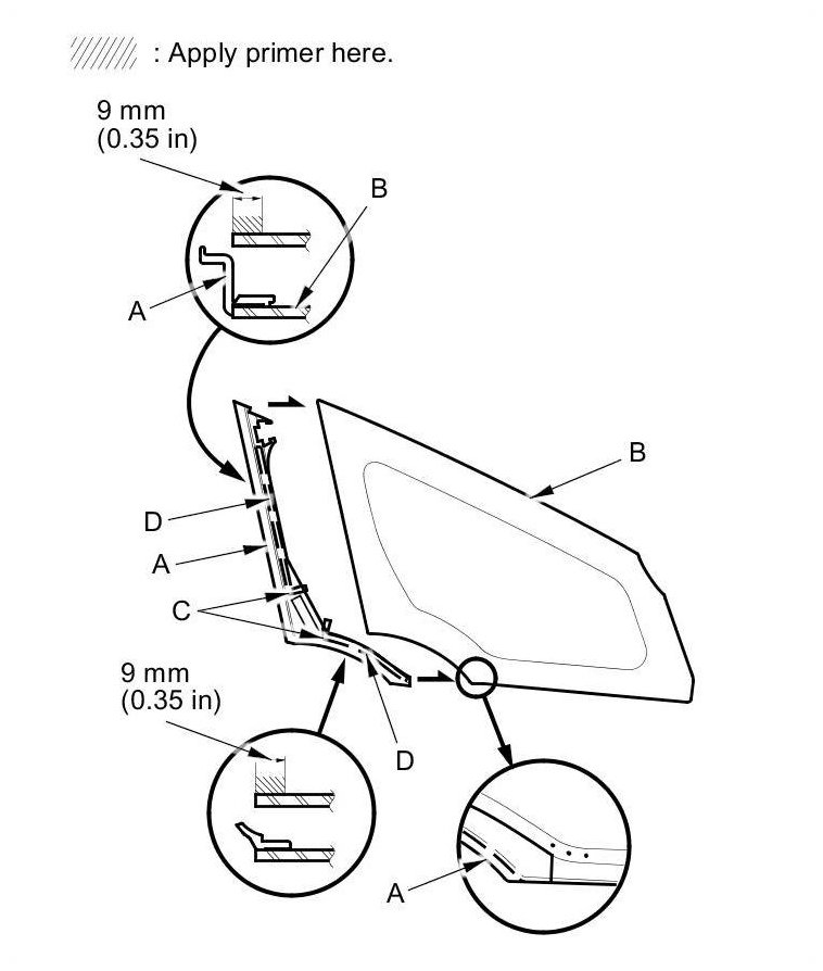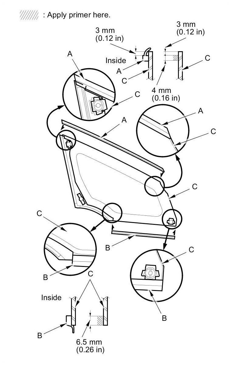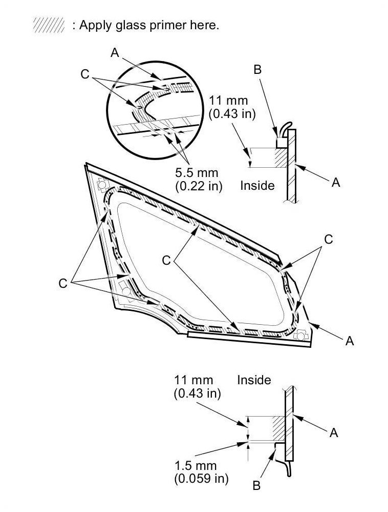 - Apply the glass primer to the front and rear portions of the front corner glass, using the printed dots (C) on the front corner glass as a guide.