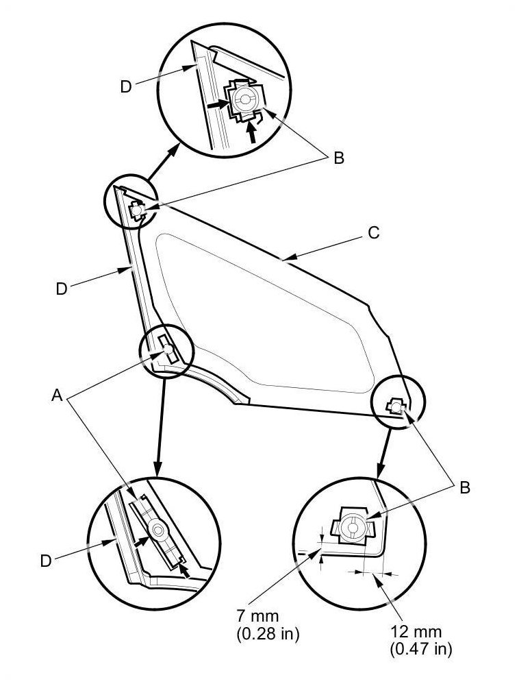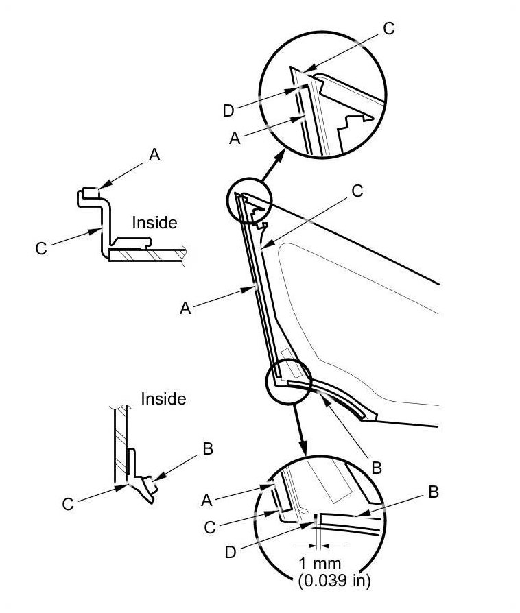 - Make sure the upper corner of the upper of clips B contacts the inner shape of the front corner trim (D).