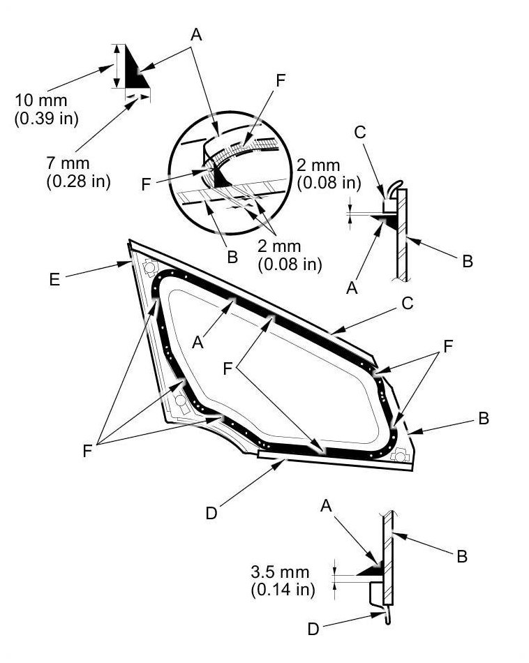 17. Put the cartridge in a caulking gun, and run a continuous bead of adhesive (A) around the edge of the front corner glass (B), along the rubber dams (C, D), and along the front corner trim (E) as shown.