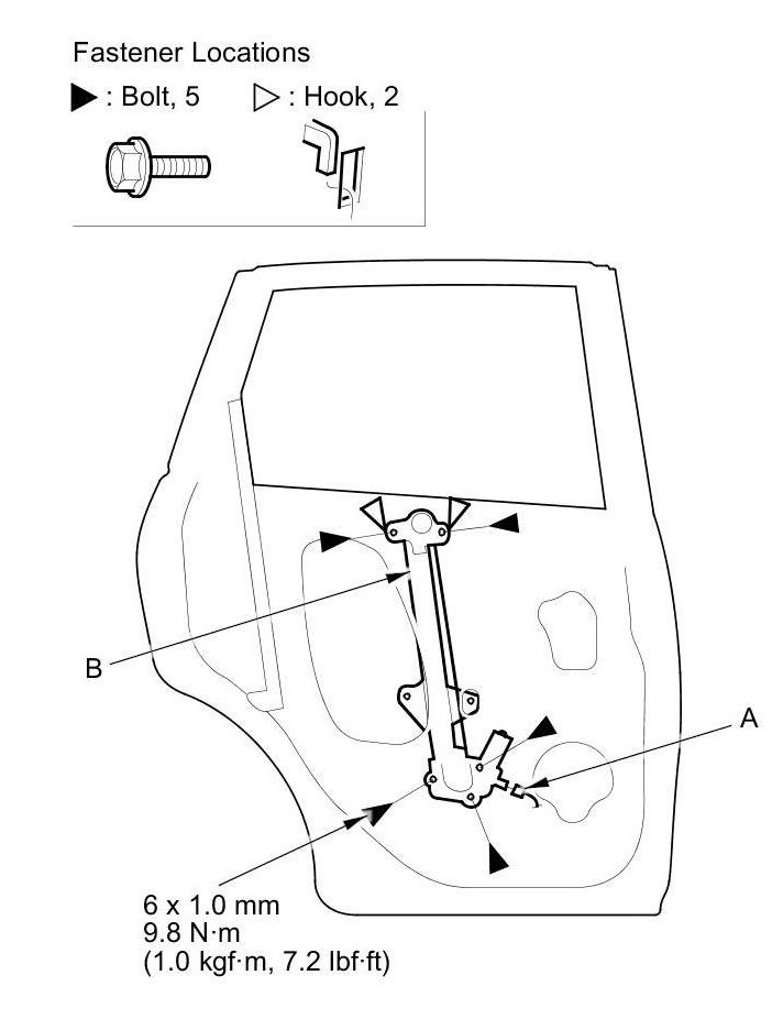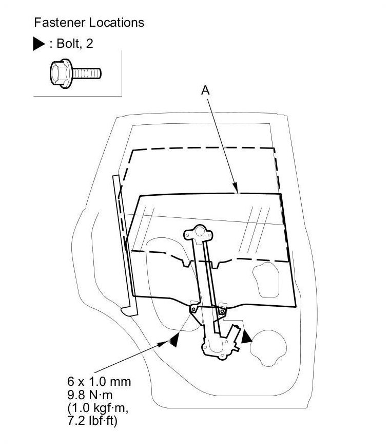 10. Remove the bolts, pull the regulator up to release the hooks, then remove the regulator through the hole in the door.