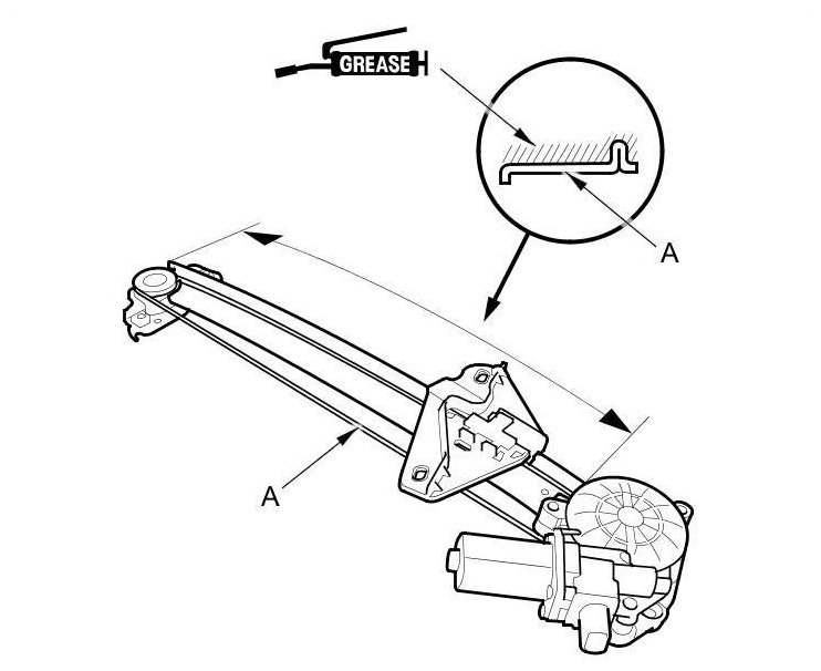 11. Apply multipurpose grease to all the sliding surfaces of the regulator (A) where shown.