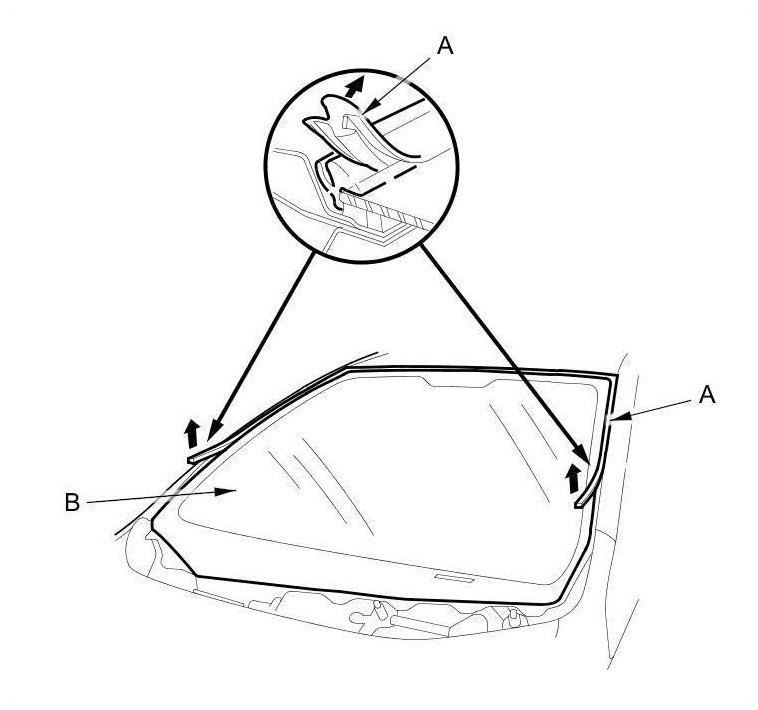 2. Remove the molding (A) from the edge of the windshield (B). If necessary, cut the molding with a utility knife.
