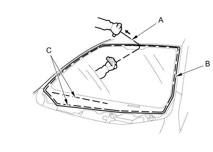 Carefully cut through the rubber dam and adhesive (C) around the entire windshield.