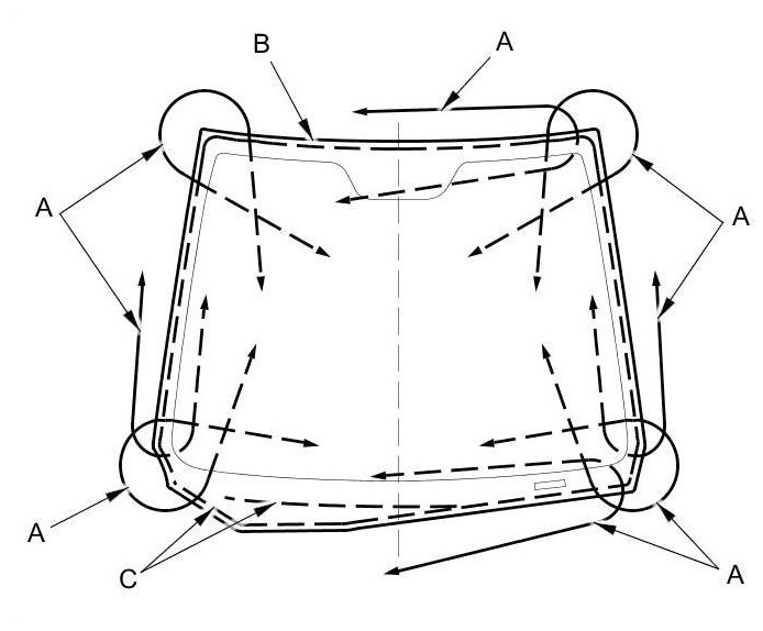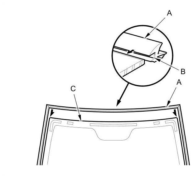 13. Keep water, dust, and abrasive materials away from the primed surfaces. Attach the molding (A) with adhesive tape (B) to the edge of the windshield (C):