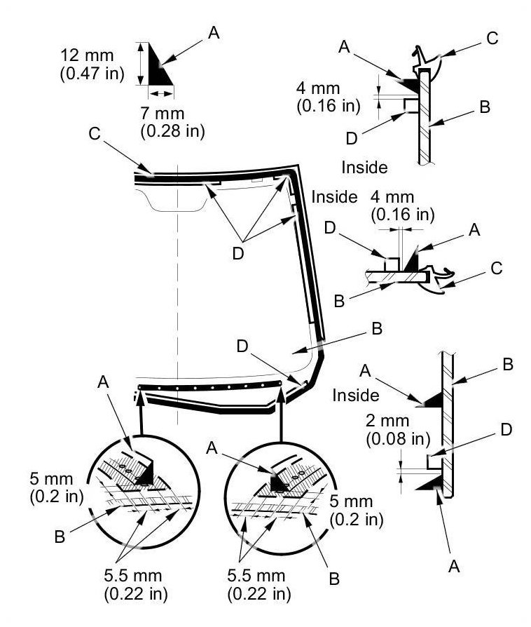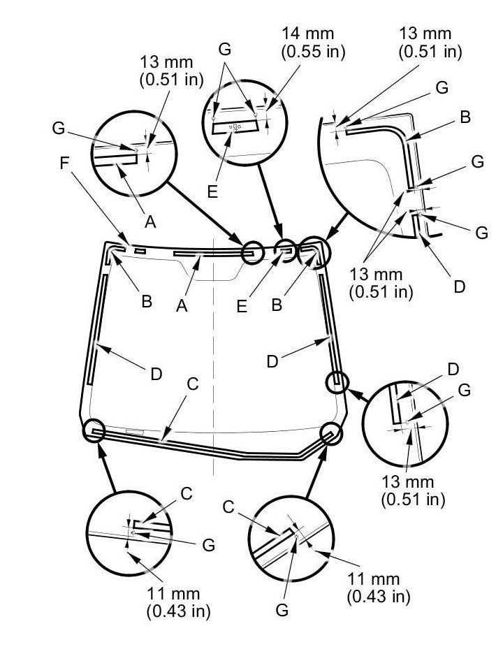 11. Attach rubber dams A, B, C, and D and the upper clips (E) with adhesive tape to the inside face of the windshield (F) as shown:
