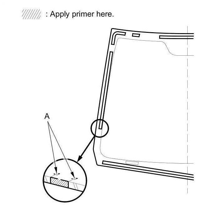 12. Apply a light coat of glass primer to the windshield edges where you will install the new molding. Use the alignment marks (A) as a guide. After the primer dries, lightly wipe it off with gauze or cheesecloth.