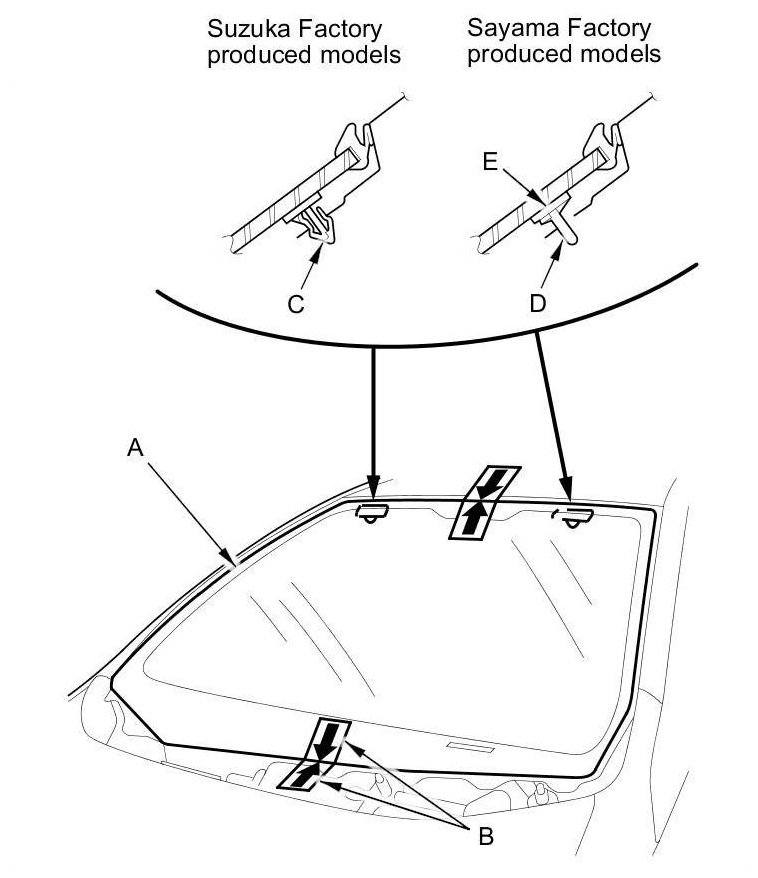 Make alignment marks (B) across the windshield and body with a grease pencil at the four points shown. Make sure both upper clips (C) are in the body holes (Suzuki Factory produced models). Make sure both pins (D) from the upper clips (E) contact the edge of the body holes (Sayama Factory produced models). Be careful not to touch the windshield where adhesive will be applied.