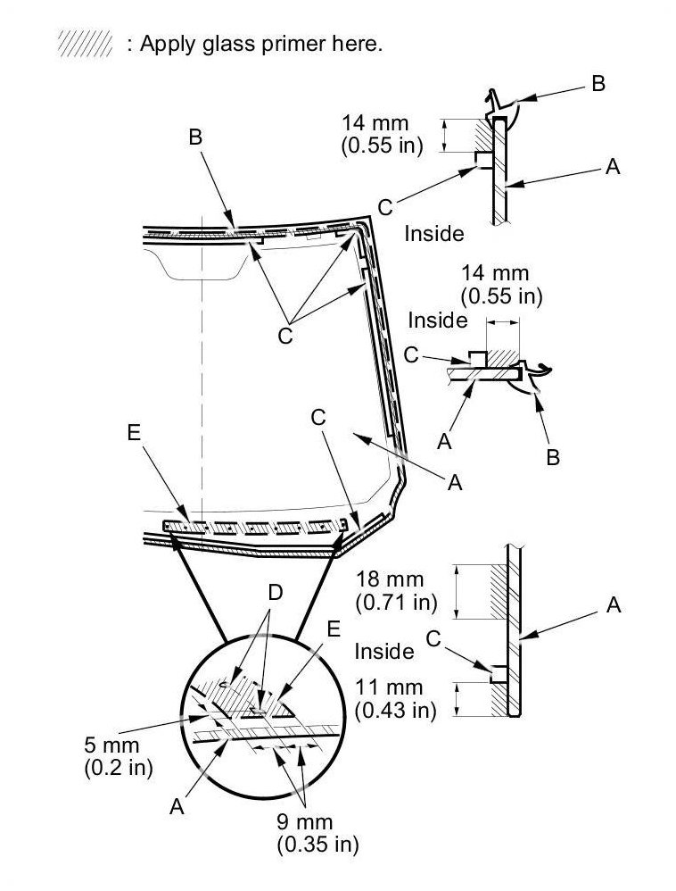 - Apply glass primer to the bottom (E) of the windshield, using the printed dots (D) on the windshield as a guide.