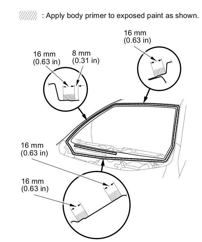 - Never touch the primed surfaces with your hands. If you do, the adhesive may not bond to the windshield properly, causing a leak after the windshield is installed.