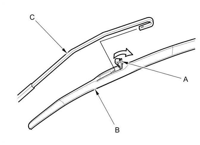2. Pull up and hold the tab (A) of the wiper blade assembly (B), and remove the wiper blade assembly from the wiper arm (C).