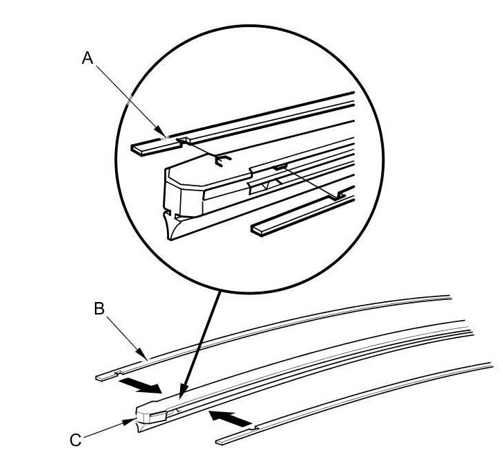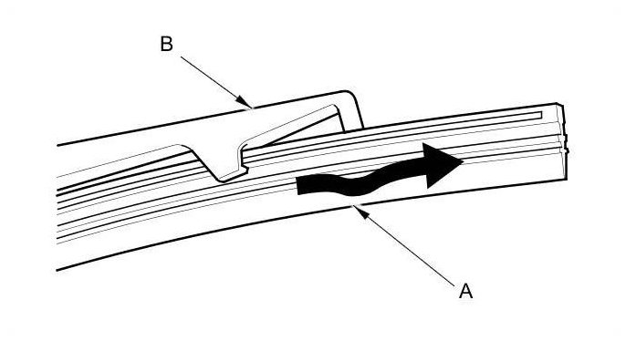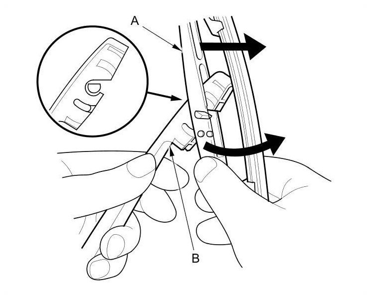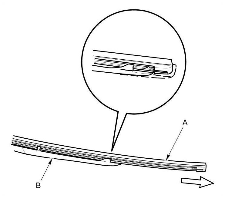 4. Align the groove (A) in each rail (B) with the tabs in a new wiper blade, then install the new wiper blade and rails into the blade holder in the reverse order of removal.