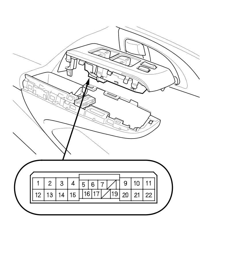 3. If the continuity is not as specified, the switch is faulty; replace the power window master switch Power Window Master Switch Replacement.