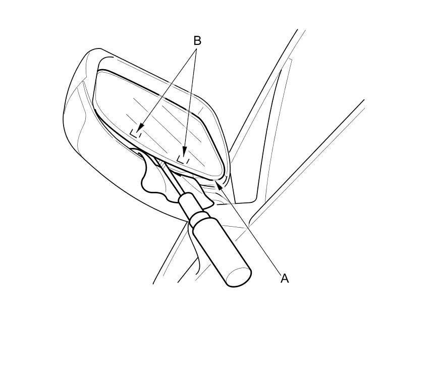 2. Put a shop towel in the opening between the bottom edge of the mirror holder and the mirror housing to prevent scratches, and detach the bottom hooks (B) with a flat-tip screwdriver.