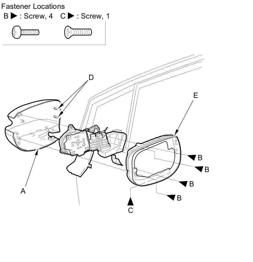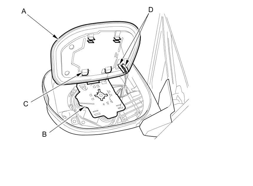 3. Separate the mirror holder (A) from the actuator (B) by releasing the hooks (C). If equipped, disconnect the mirror defogger connectors (D).