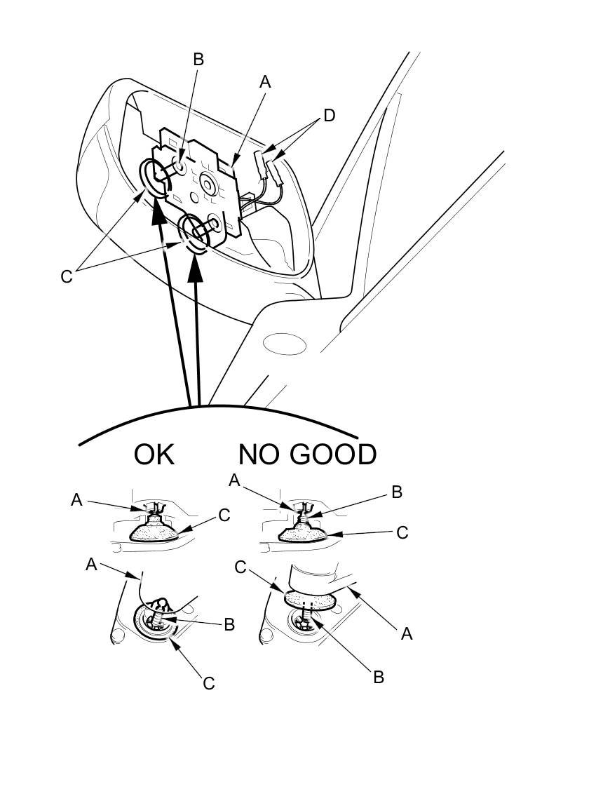 5. Before reinstalling the mirror holder to the inner holder (A) of the actuator, check the actuator rods (B) and the actuator boots (C).