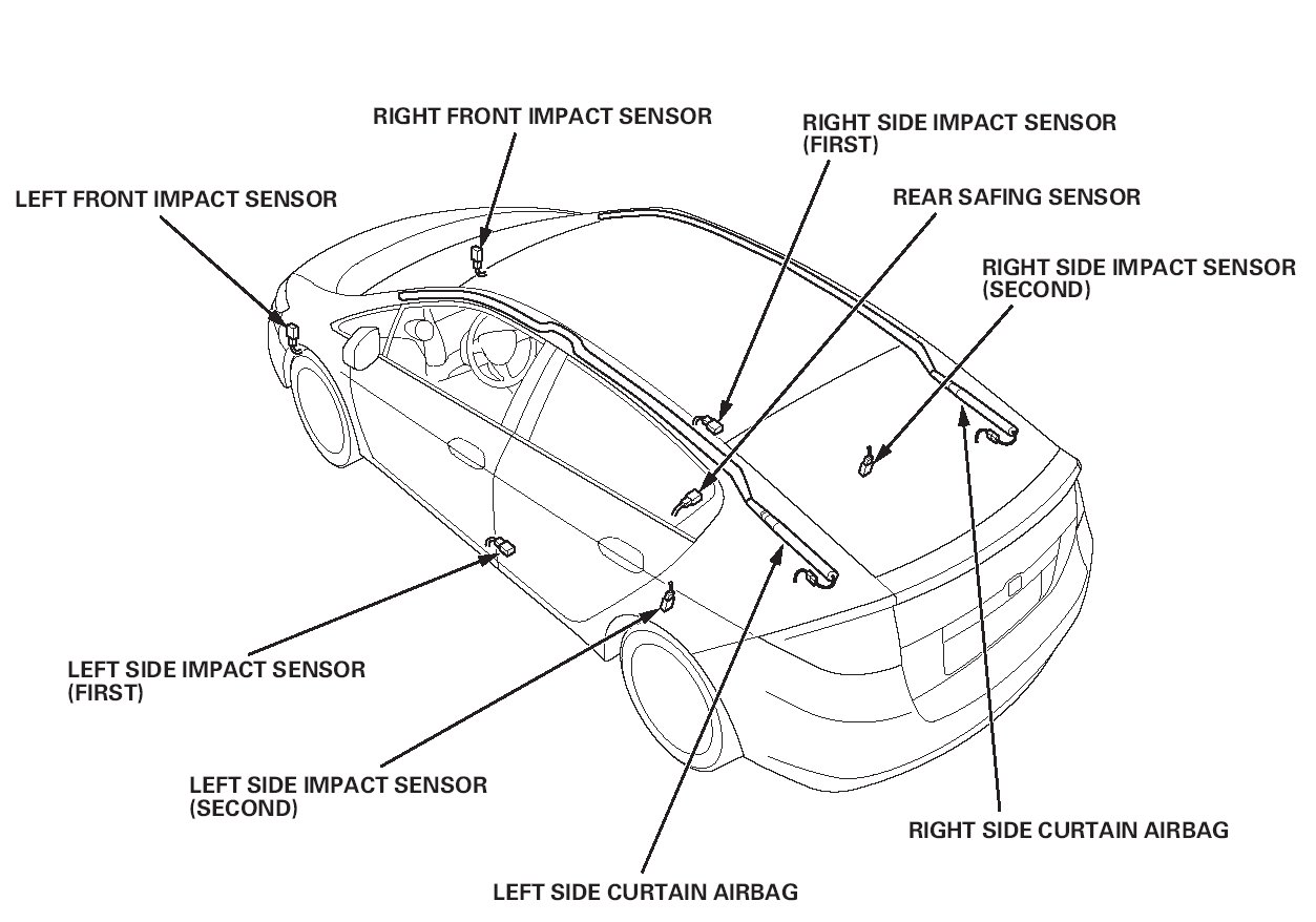 This model has an SRS which includes a driver s airbag in the steering wheel hub, a passenger s airbag in the dashboard above the glove box, the seat belt tensioners in the front seat belt retractors, the side airbags in the front seat-backs, and the side curtain airbags in the sides of the roof. The SRS unit is separate from the airbag assembly and has built-in sensors. The following precautions should be observed when doing sheet metal work, paint work, and repair work around the locations of the SRS components.