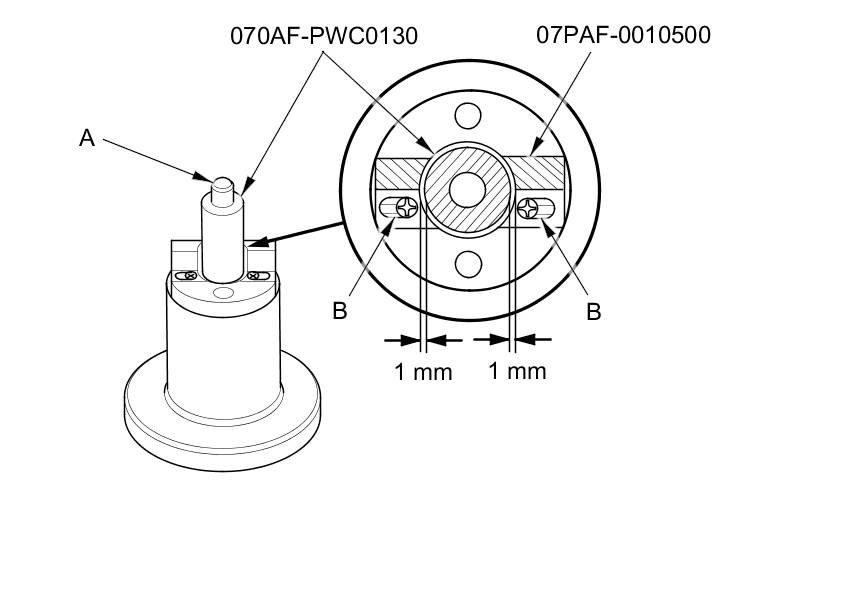 2. Temporarily install the pilot collar, O. D. 18 mm over the pilot pin (A), and adjust the piston base head insert as shown, then tighten the screws (B). Remove the pilot collar.