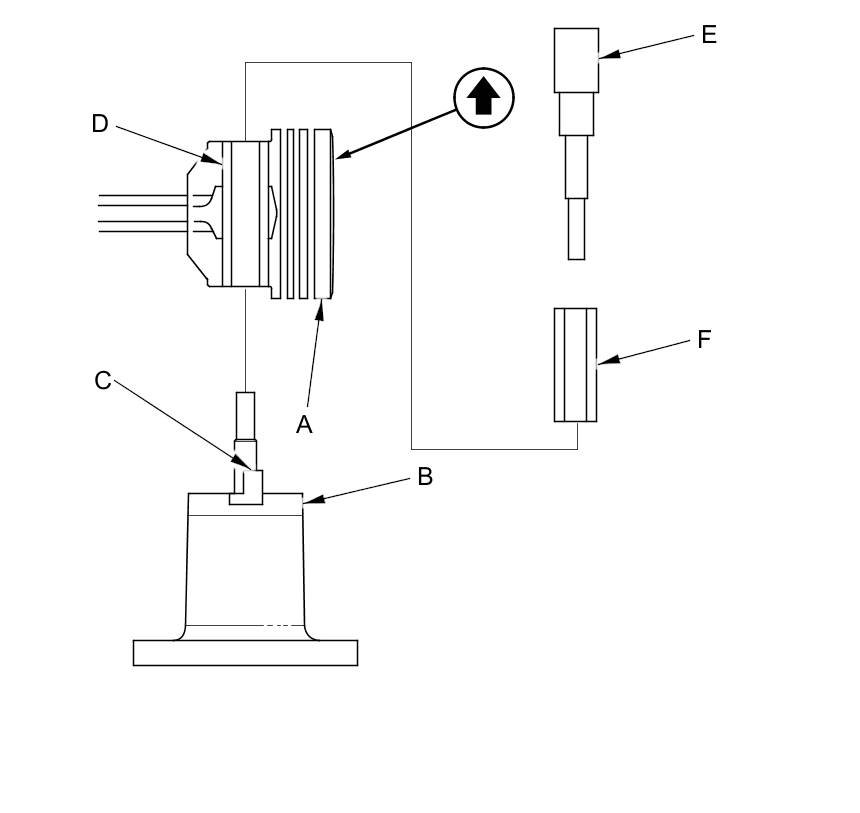 5. Press the pin (D) out with the insert pin and the insert adjust (E), the pilot collar (F), and a hydraulic press.